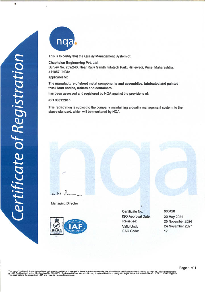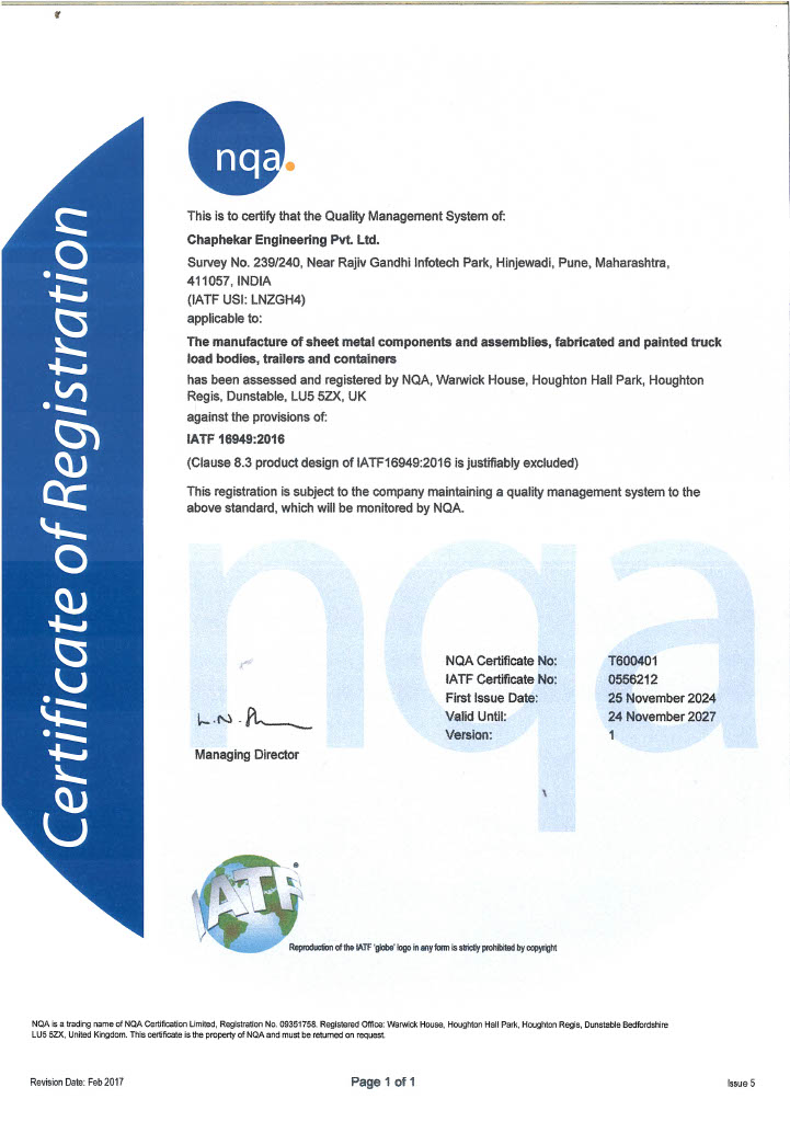 We, at Chaphekar Engineering set standards for measuring excellence – with skilled professionals that act as catalysts to transform dreams into reality. Our Internal Quality systems are stringent and the manufacturing process thorough. We constantly strive to be ahead of the curve by infusing new talent, adopting newer technologies and inculcating manufacturing discipline. We work closely with customers to build a relationship characterized by a vigorous and constructive approach towards quality. Reason enough for us to earn the coveted ISO/TS 16949 certification from URS.